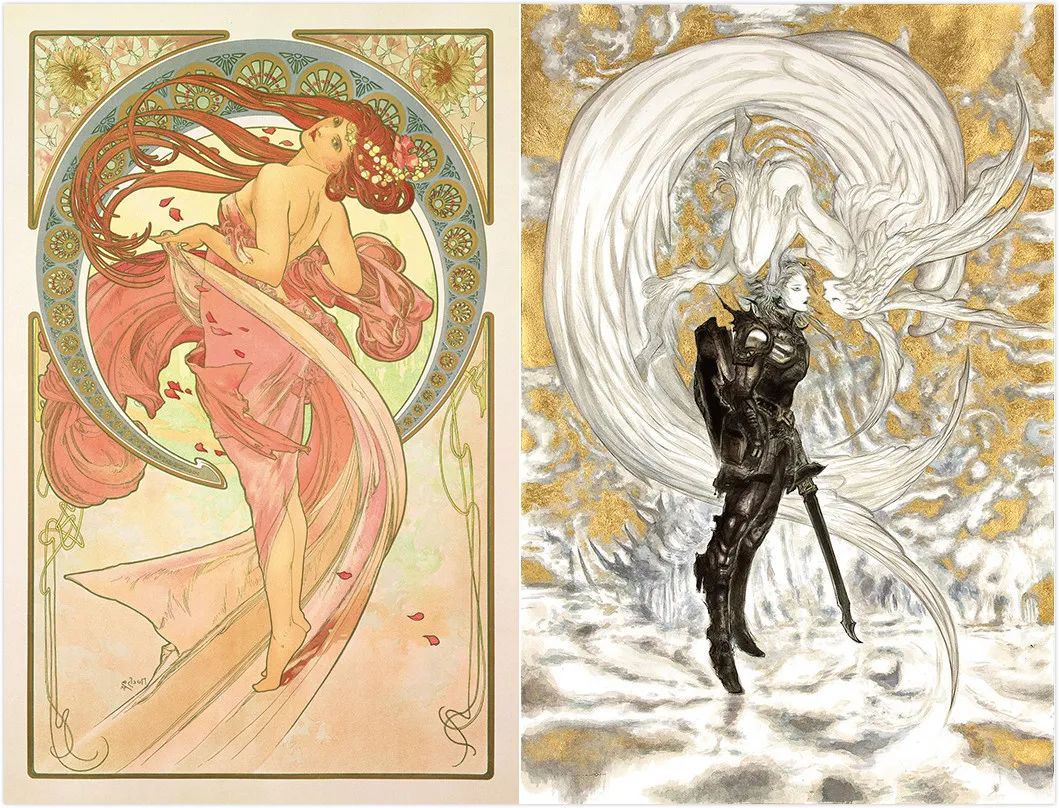 之前的文章中提到過,天野喜孝在為各個幻想小説的名系列繪製封面及插圖時,就頻繁借鑑穆夏的手法,他也公開表示過自己確實深受穆夏作品的啓發。在他為**《最終幻想》**所作的原案設計中,我們就可以明顯地看到他對穆夏的構圖方式的參考。
