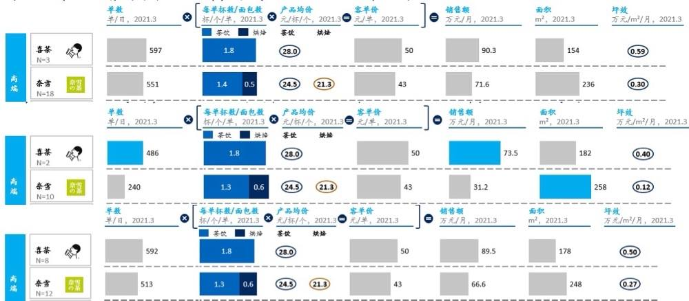 “奈雪的大店模式需要優化。奈雪的茶的門店定位是第三社交空間,所以標準店都是200-300㎡,喜茶平均是120-150㎡,以2021年3月調研的一線城市門店為例,奈雪為551單,略低於喜茶的日均597單,説明單店集客能力並不差,奈雪需要改善空間利用率”,陳晨説。