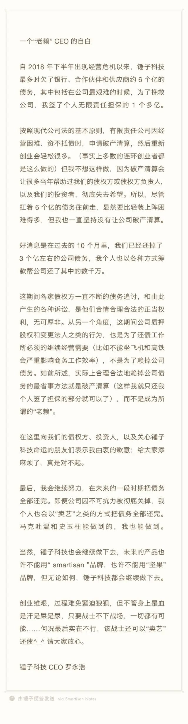 6月11日,羅永浩的“交個朋友直播間”在微博回應,這筆債是經營手機期間產生的,已經和債權人達成和解,正在撤銷案件。羅永浩正在努力掙錢,請大家放心。