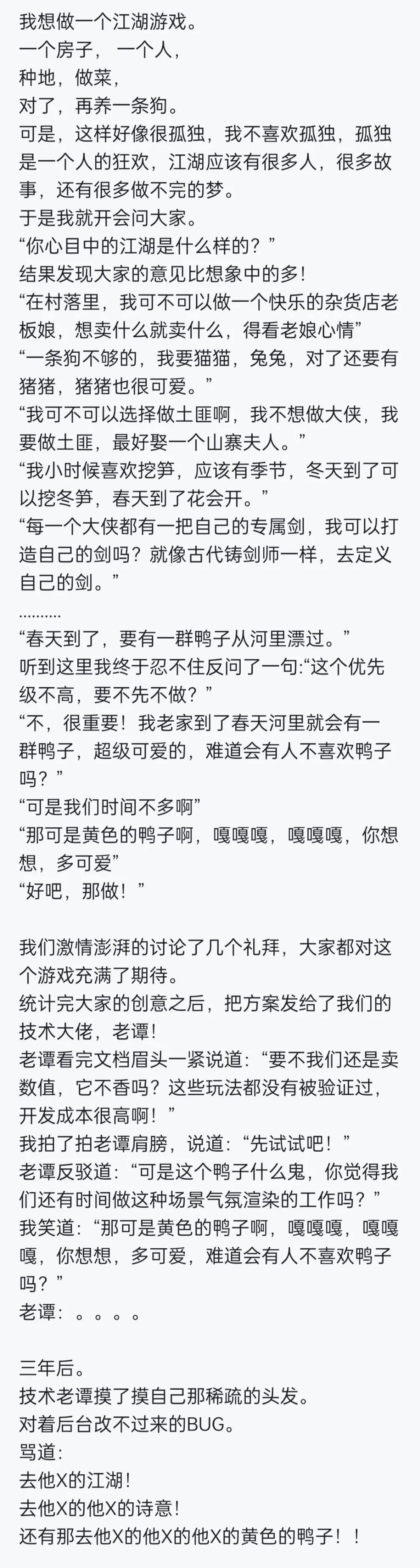就是這個故事,讓我在去年就決心做一次關於《江湖悠悠》的採訪。因為我很想搞清楚,為什麼我會因為小鴨子觸動?這個遊戲又為什麼讓我覺得親切?因為這些問題,這次採訪也顯得有點特別——通常的產品採訪中,我們總是聊研發、市場,可這次卻變成了聊創作、文學。