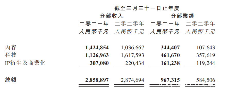 首先,最直觀的變化體現在業務披露口徑上。由此前的互聯網宣發、內容製作以及綜合開發,重塑為內容、科技、IP衍生及商業化全新的業務版圖。