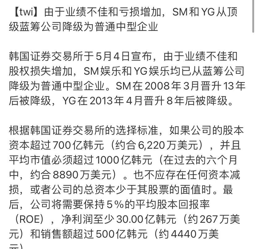 “SM的勢頭遠遠不如從前”並不是假話。今年5月4日,韓國證券交易所宣佈,SM娛樂與YG娛樂由於業績不佳和股權損失增加,從藍籌公司降級為普通中型企業。