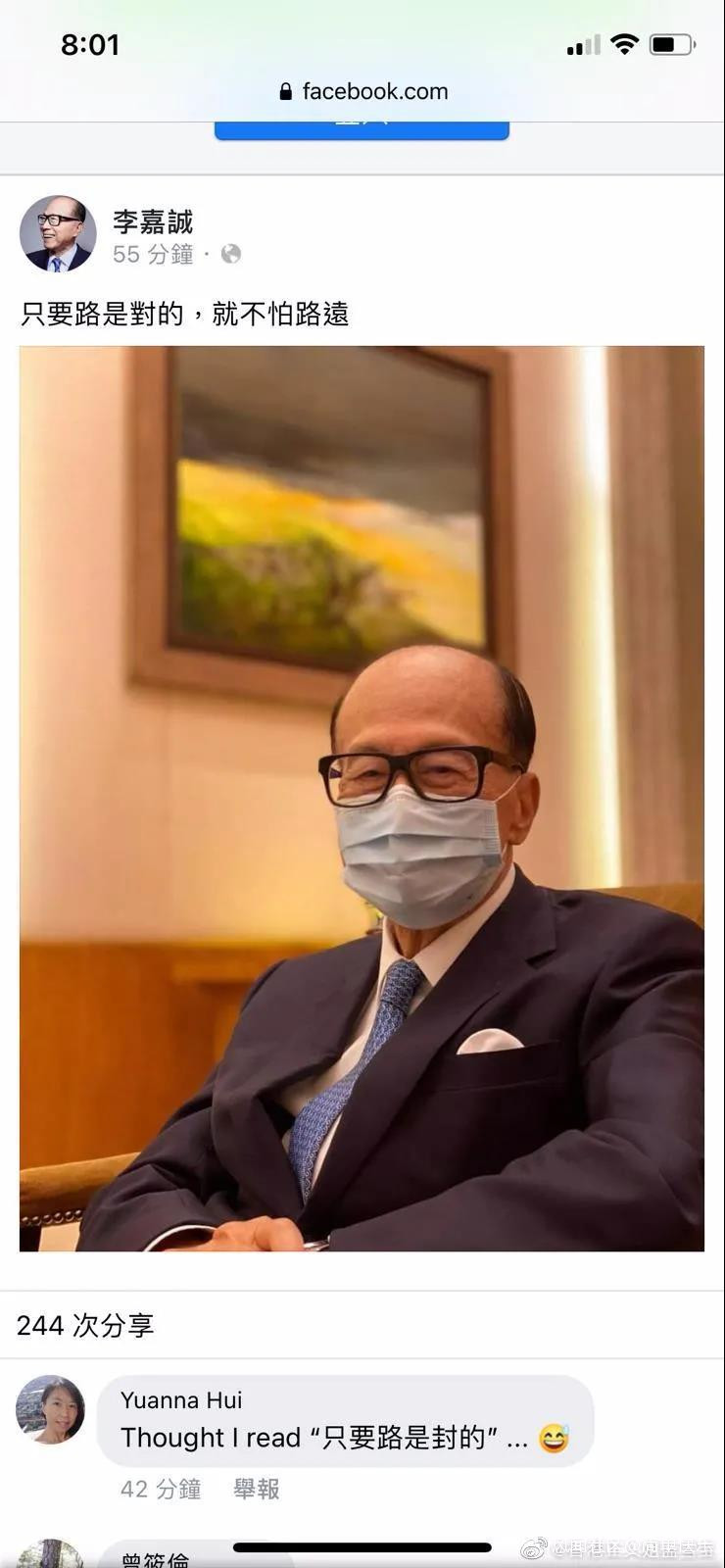 兩年後,黑暴再現香港街頭,李嘉誠也再次在facebook上發聲,稱:“只要路是對的,就不怕路遠”。特意挑在這一天發聲,其意旨非常明確。