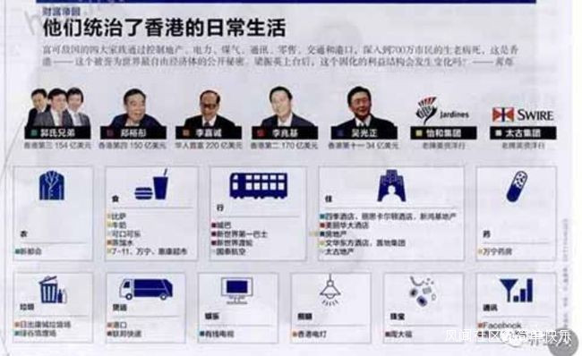 彭博商業週刊曾在一篇題為《好的資本主義,還是壞的資本主義,香港要做出正確選擇》的文章中,用一幅圖簡潔了當的説明李嘉誠為首的富可敵國的香港“四大家族”是怎樣控制700萬市民的生老病死。