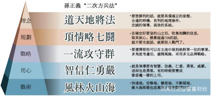 孫正義熟讀《孫子兵法》,並且提煉了兵法中的25字口訣:一流攻守羣,道天地將法,智信仁勇嚴,頂情略七鬥,風林火山海。
