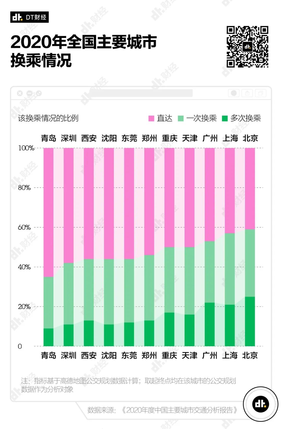 根據高德地圖的《2020年度中國主要城市交通分析報告》,全國主要城市通勤平均換乘次數都在1次內,這也許是城市交通對通勤族最後的温柔。青島在通勤換乘次數上表現最好,高達65%的被調查者表示可以乘坐直達公共交通上班。而在北京、上海、廣州的朋友中,有超過五分之一的被調查者表示,通勤時要換乘2次及以上的公共交通。
