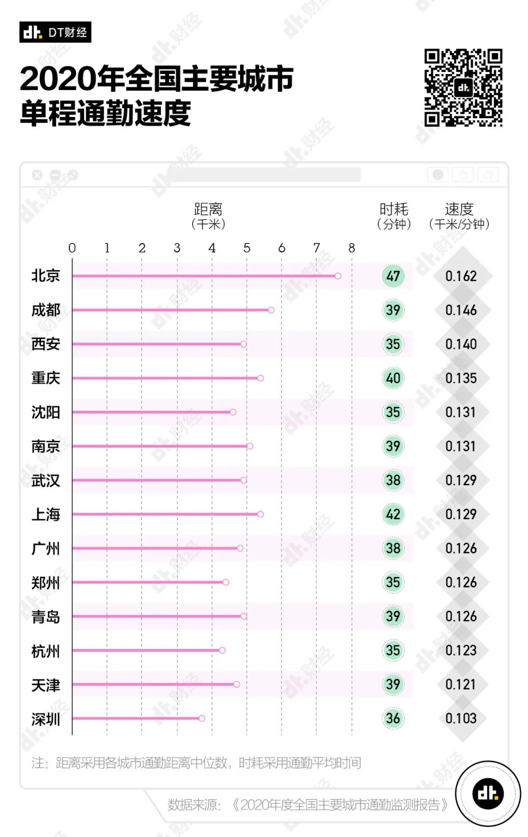 高德地圖的《2020年度全國主要城市通勤檢測報告》顯示,擁有極端通勤問題最嚴重的北京,通勤的時耗和距離最長。事實上北京已經很努力了,如果將通勤距離除以通勤耗時,我們發現,北京的通勤速度是最快的,達到了0.162千米/分鐘。