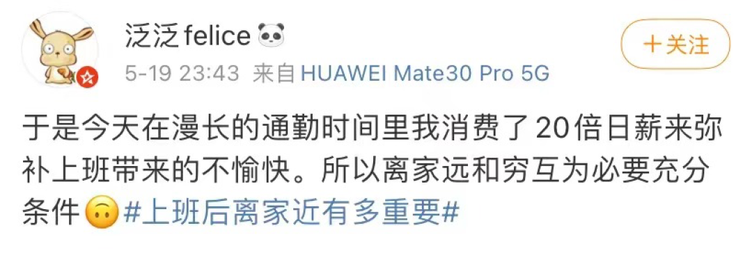 有網友就曾在接近凌晨時在社交平台上感嘆「上班後離家近的重要性」,吐槽自己因為漫長的通勤導致自己消費了20倍的日薪來彌補上班的不愉快。