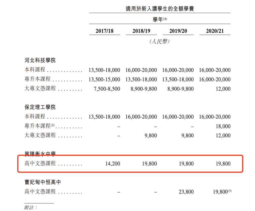 由此可見,“衡水”的收費標準很可能高於一般學校的平均學費水平。另據賀陽教育招股書顯示,2020/21學年,賀陽衡水中學、曹妃甸中恆高中的學費標準也高達19800元。與之形成鮮明對比的是,同期賀陽教育旗下河北科技學院的本科課程學費卻僅在16000-20000元。