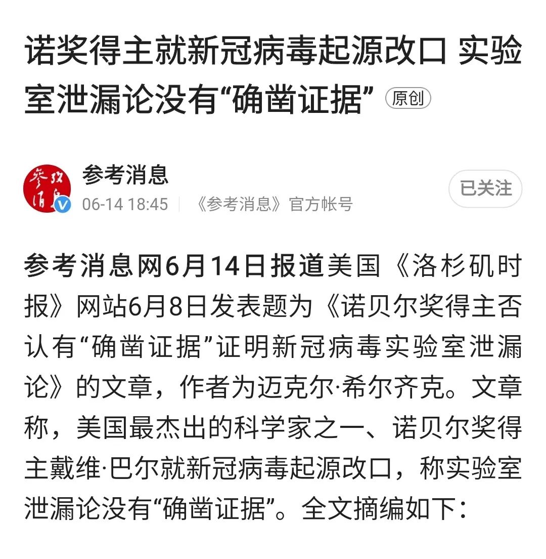 6月14日,參考消息引述的諾獎得主改口報道(見上圖)來自《洛杉磯時報》6月8日,其完整的報道,一樣提到了所謂的可能蝙蝠起源論。