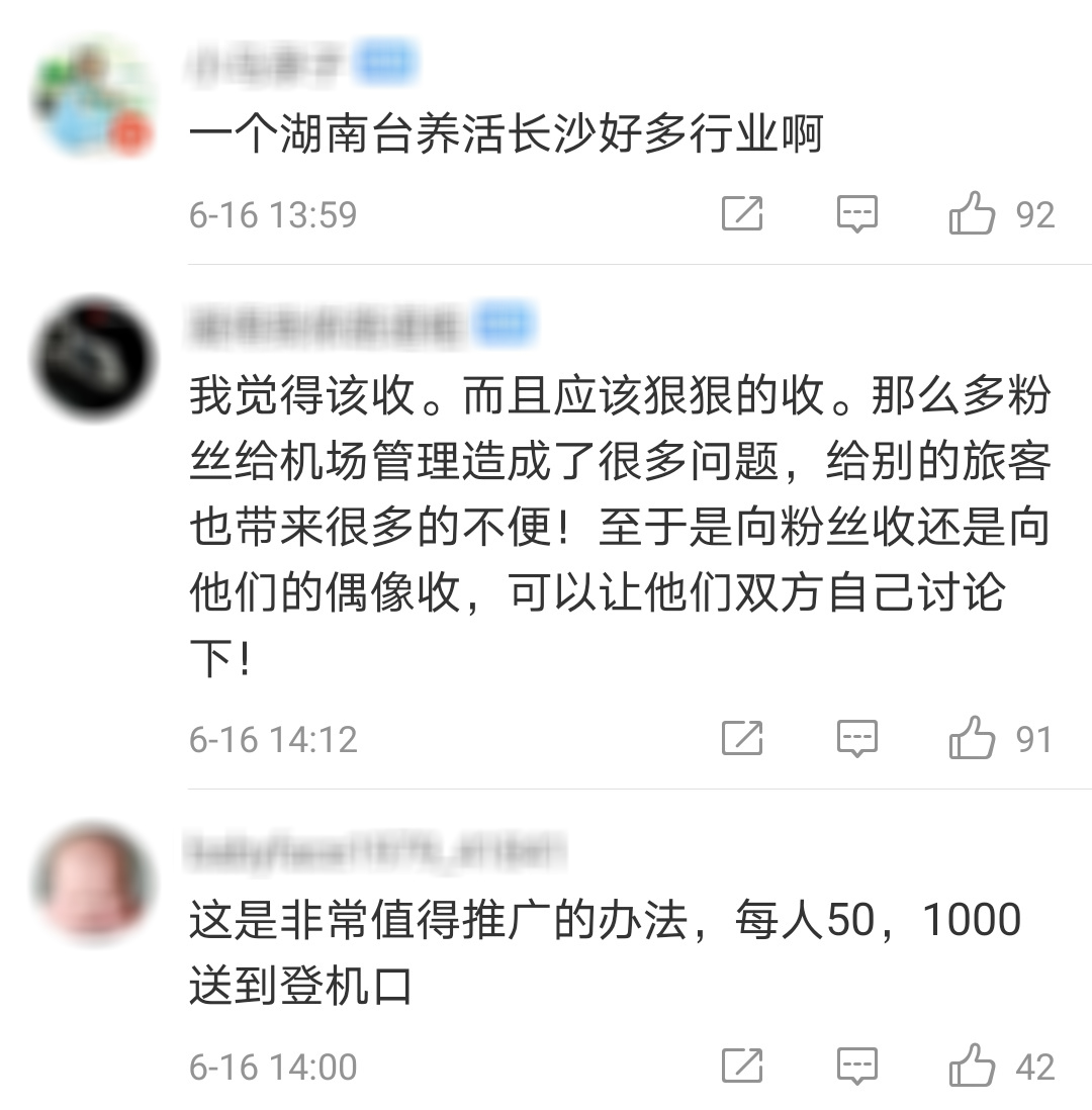 6月16日,一民眾向澎湃新聞報料,長沙黃花機場常有藝人現身,因而經常出現粉絲聚集接送機的情況,機場關聯公司按照粉絲數量,分不同標準向節目組或是粉絲公會收費,超50人交3千元;如果一個節目組同時邀請了多名藝人,會分別收取費用。