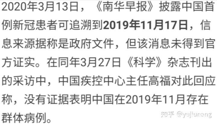 1、中國2020年1月11日,武漢衞健委公佈武漢最早的新冠發病日期為2019年12月8日,同年2月26日官方再次確認了這一信息。迄今為止這仍舊是中國官方承認的最早病例。