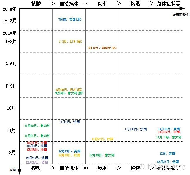 下面以一張圖概括迄今為止各國的溯源情況,圖中列出了各國發現的最早病例情況或病毒存在跡象,其中縱座標是時間,只收錄到2019年底,橫座標是證據可靠性,圖中標識“弱”字的代表這條信息可靠性較差(部分是因為現有研究不支持新冠早於2019年9月下旬開始傳播的觀點,參見新冠溯源信息彙總4——系統進化樹)