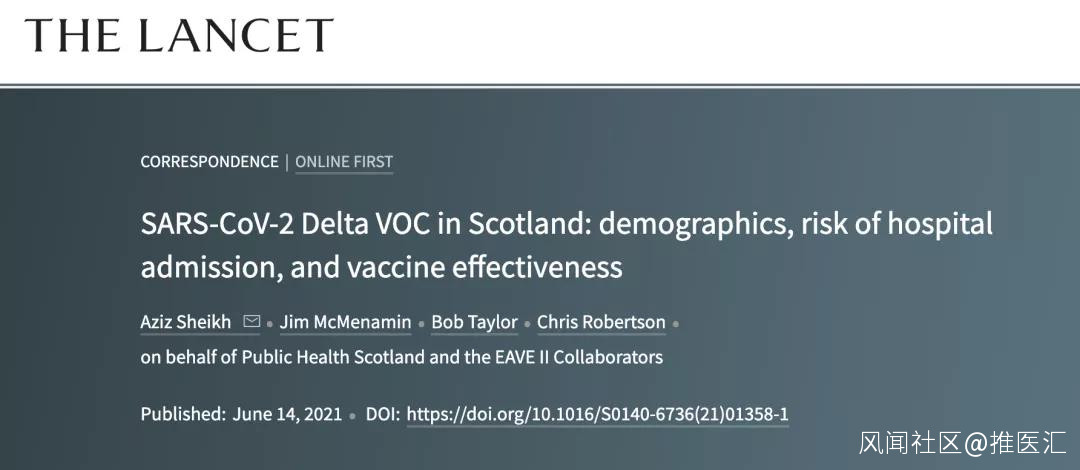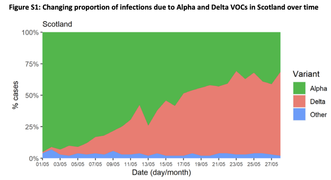 6月14日,《柳葉刀》在線發表通訊文章指出,來自印度變種B 1.617.2迅速成為蘇格蘭地區SARS-CoV-2 的優勢毒株。而Alpha VOC(以前稱為 Kent VOC、B.1.1.7 或 S 基因陰性)是以前優勢毒株,但它已迅速被取代。