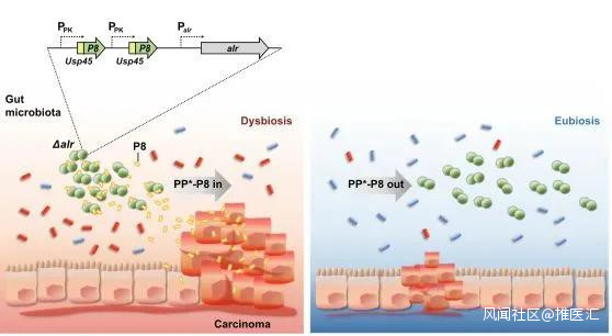 示意圖描述了具有ALR互補系統的合成益生菌PP*-P8的預期作用模式