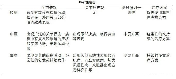RA病因複雜、病程漫長,尚無法徹底根治,而RA症狀表現和預後情況因人而異,因此在保險風險評估中,主要依據該病的嚴重程度進行相應的風險評估,一般分為輕度、中度、重度三種,主要表現如下: