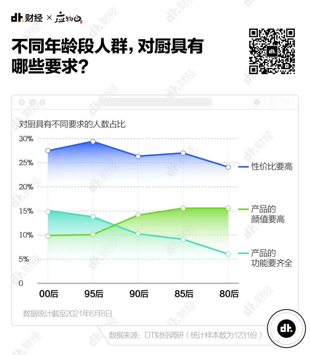 類似的情況也發生在消費者購置其他餐具、廚電的過程中。從年齡來看,年齡越大的消費者反而更看重顏值,他們比年輕人更不在意性價比,也更不在意產品的功能是否齊全。