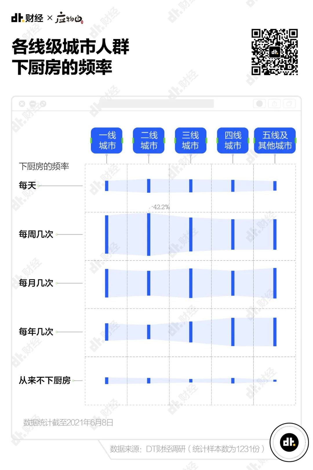 在一二線城市中,每週都要做幾次飯的年輕人,佔比達到48.1和55.8%。但在四五線城市,這個數字分別是41.9%和39.6%。