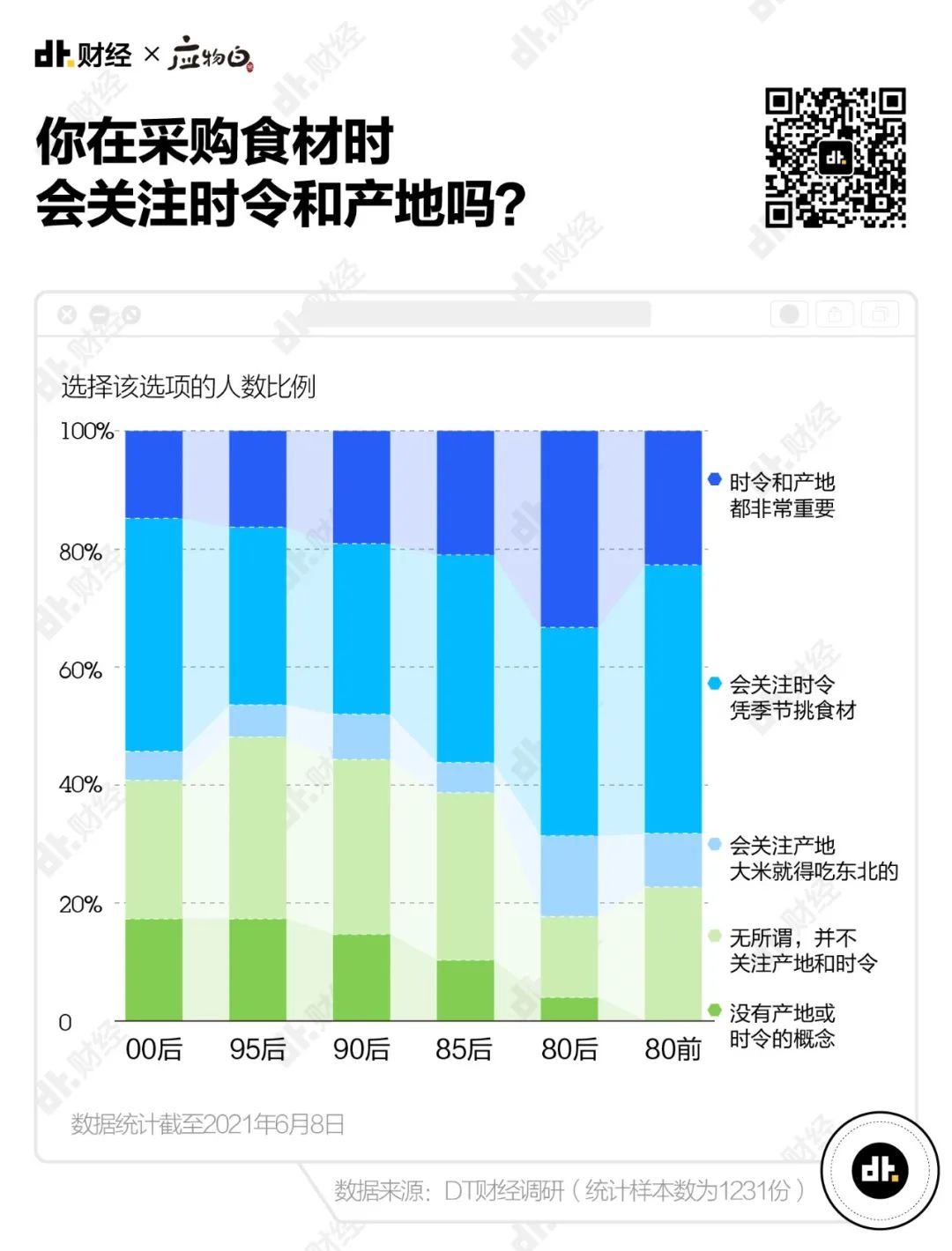 這個結果似乎又一次佐證了,年輕人“能夠讓生活迴歸本質,讓自己覺得開心就好”的下廚態度。他們購買食材的過程,其實更傾向於“商家給什麼,他們就買什麼”。但是隨着年紀逐漸增長,人們開始更加關心食材本身的時令和產地。