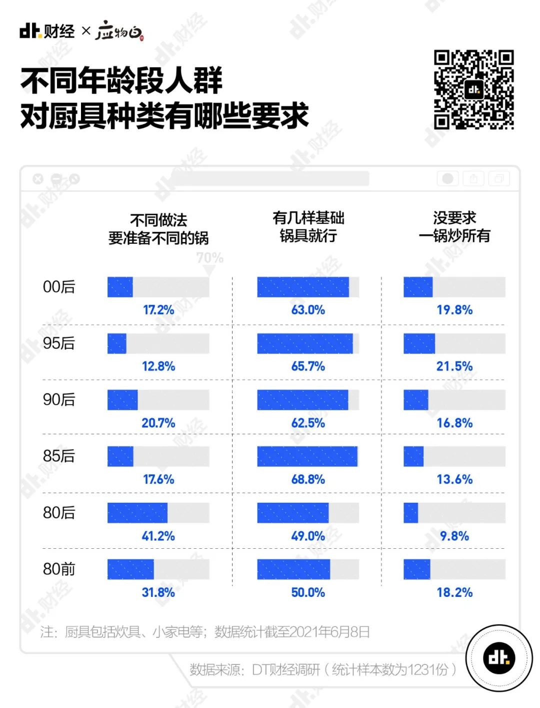 因為從85後到00後,只有不到2成的人願意為廚房添置各種鍋具。但在80後和80前羣體中,分別有4成和3成受訪者,相當在意鍋具的種類。