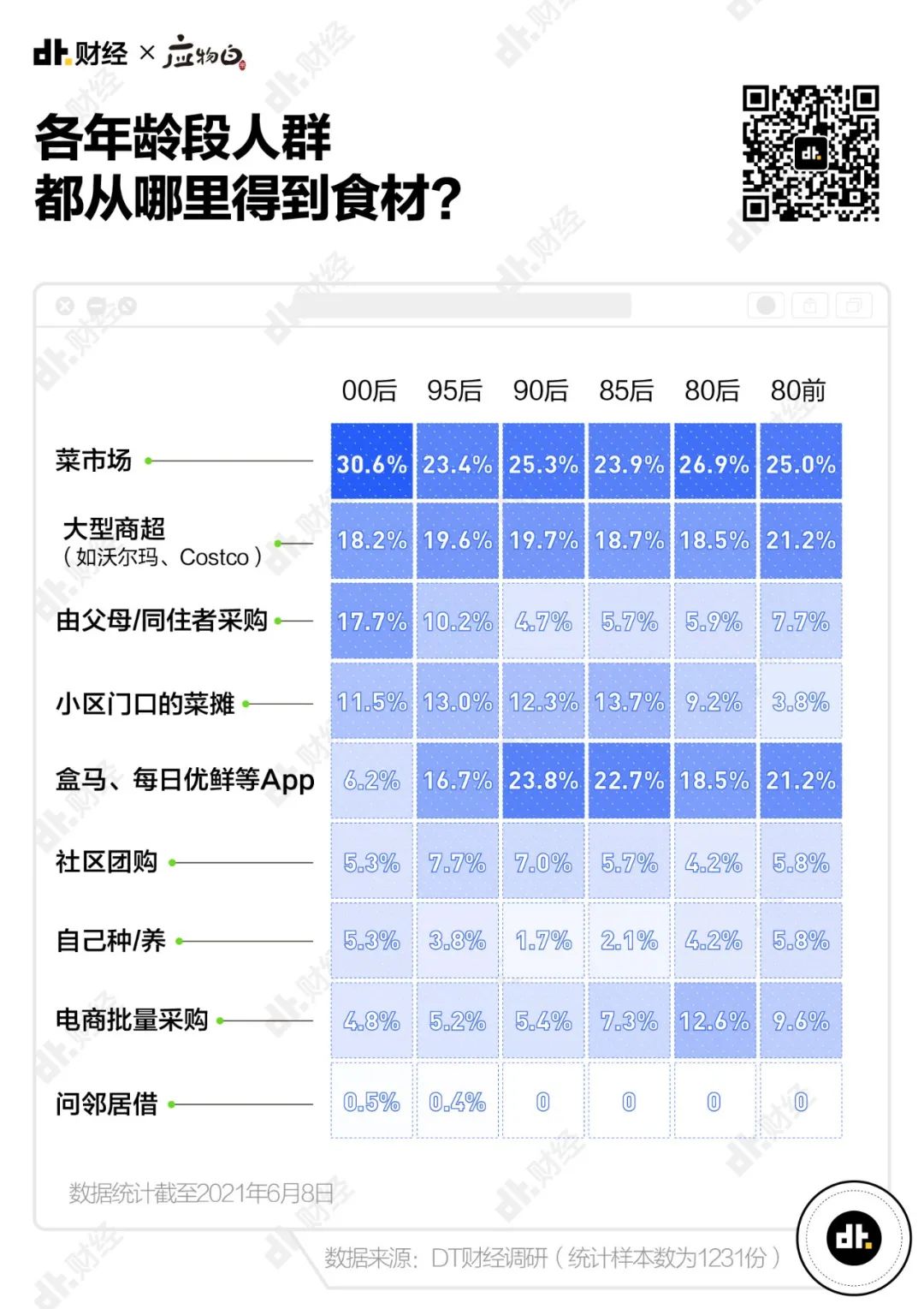 各年齡段的“家庭米其林主廚”們,最主要的食材來源分別是菜場、生鮮APP和大型商超。