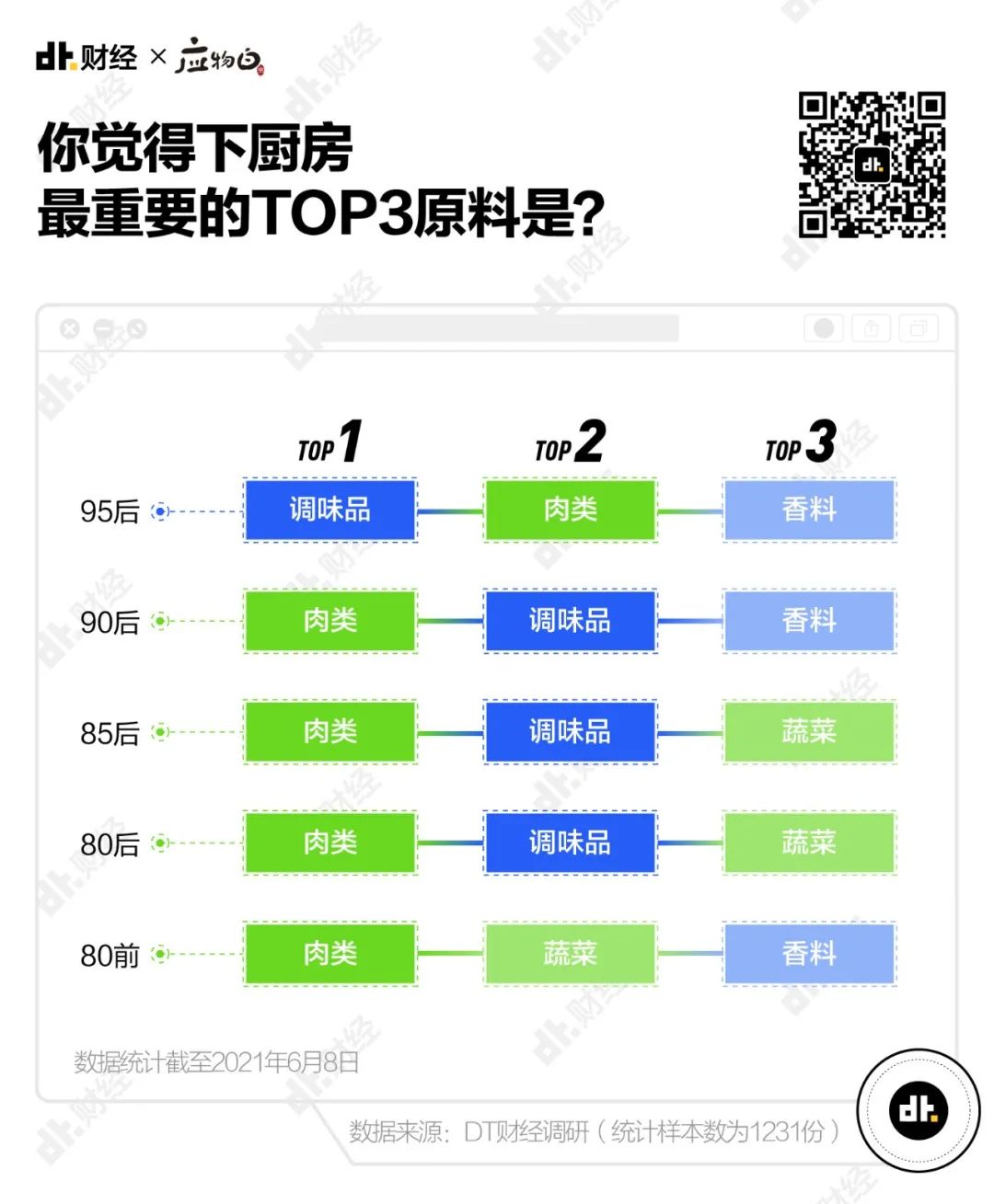 調查中,40歲以上的人羣最看重的TOP3原材料是肉類、蔬菜和香料。也許人到了年紀,就會不由自主地開始控制調味品的攝入。