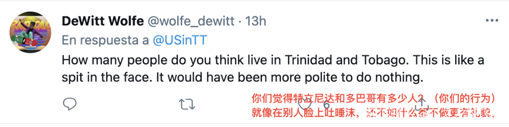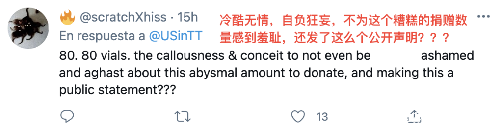 很多網民更是直白地表達了對美國輕視他國人民生命的不滿,表示這次向特多的捐贈不如説是一種“侮辱”。