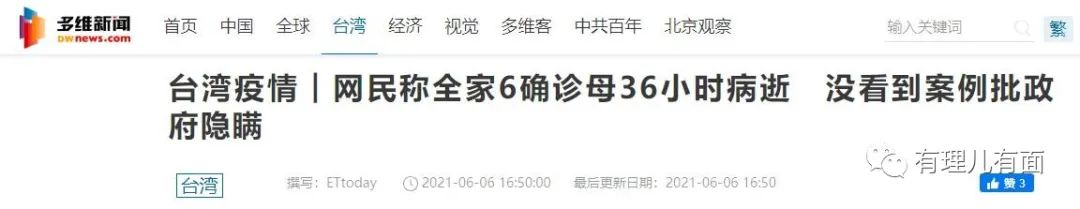 剛才説的一家4口案例中,民進黨當局就認定為一般死亡,不算入新冠死亡病例。6月6日也有死者家屬哭訴家人因新冠病逝,卻被民進黨當局隱瞞。這些只是爆出來的,沒公佈的只會更多。