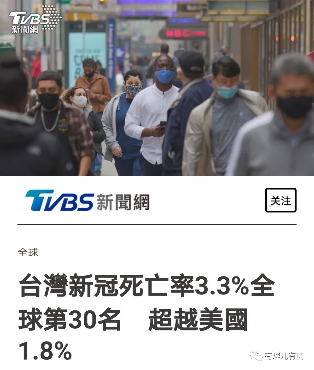 台媒TVBS報道,截止13日,台灣死亡率高達3.3%,不僅高出全球平均值,根據約翰霍普金斯大學截至美東時間12日的數據統計,台灣死亡率排名已升至全球第30名,而目前看似已進入“後疫情”生活的美國,死亡率則只有1.8%。
