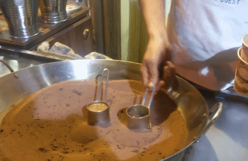 從視覺上來説,土耳其的沙煮咖啡就像咖啡液從器皿中自己生長出來。在一盆持續加熱的沙子中,咖啡師晃動着特製咖啡勺在沙子中摩擦一會兒,沸騰的咖啡就會取之不盡般從壺裏不斷溢出。