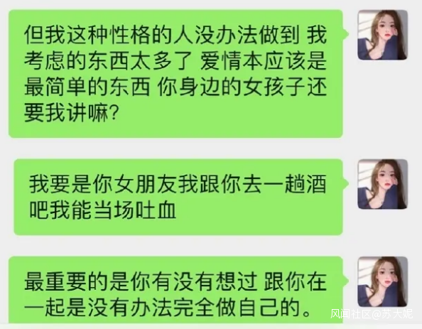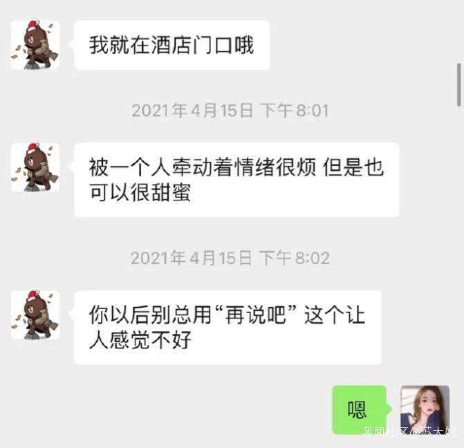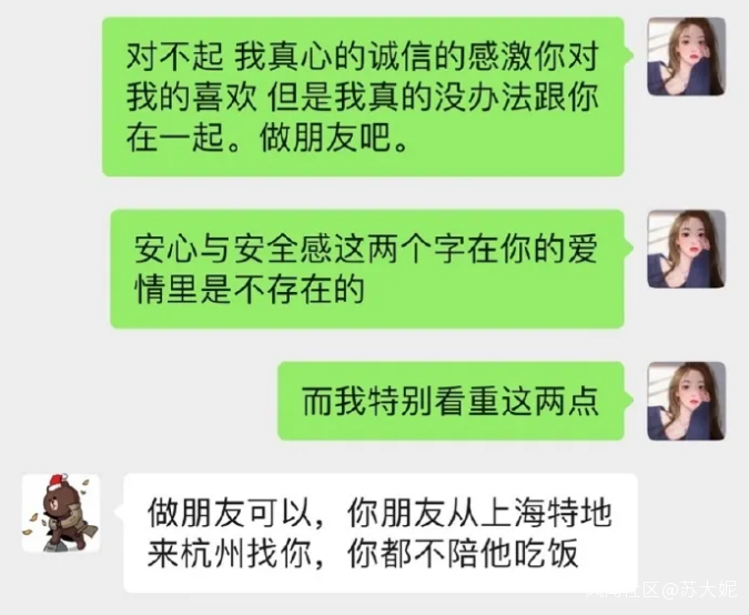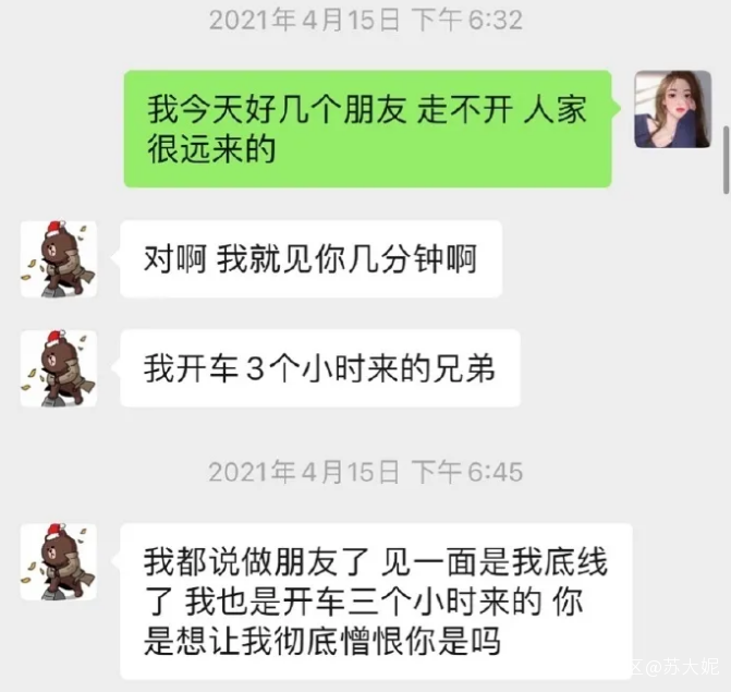 SYN的行為基本上是一個典型。前期對方的邀約基本都會回應,但是希望帶朋友一起去。聊天基本也都會回覆,但是會通過不及時回覆委婉表達自己不感興趣不想聊天的意願。被質問不回覆的時候還是會用看直播作為理由。