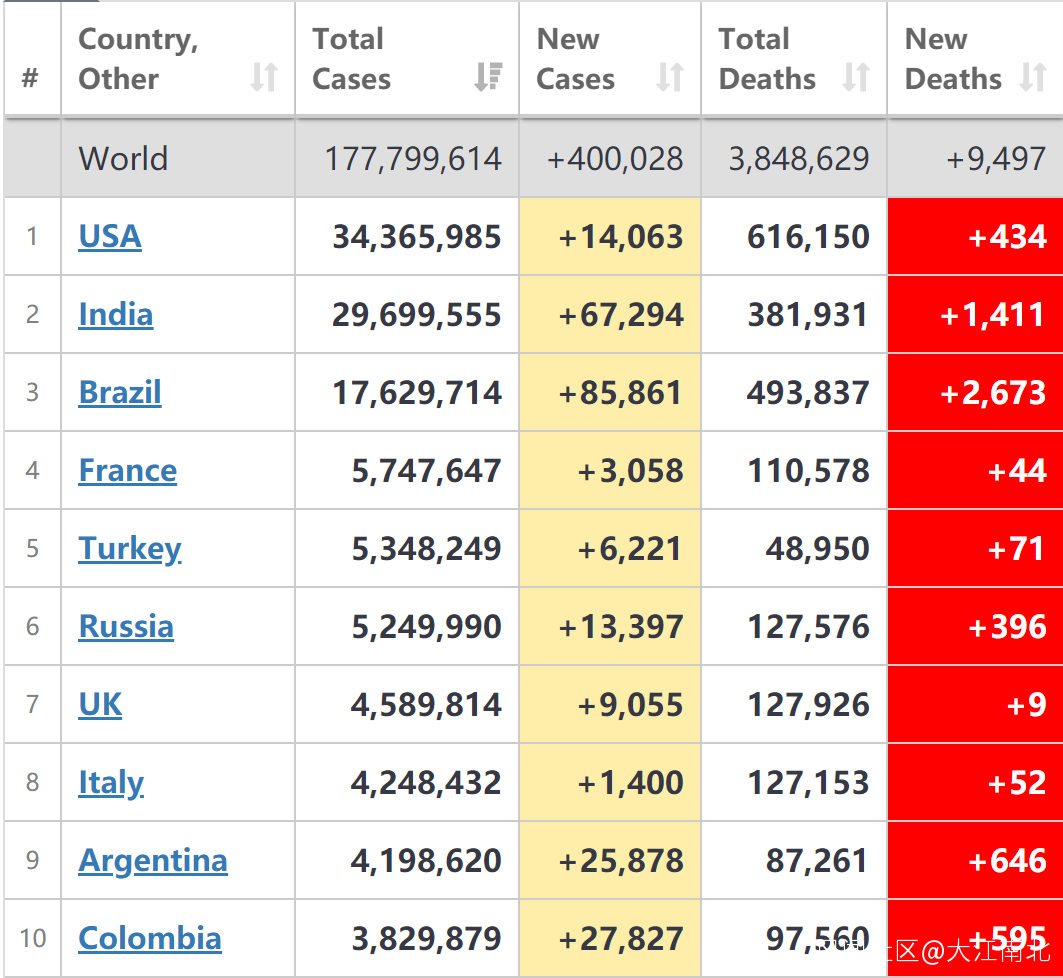 法國、土耳其、俄羅斯、英國、意大利、阿根廷、哥倫比亞分列累計確診第四到十位。