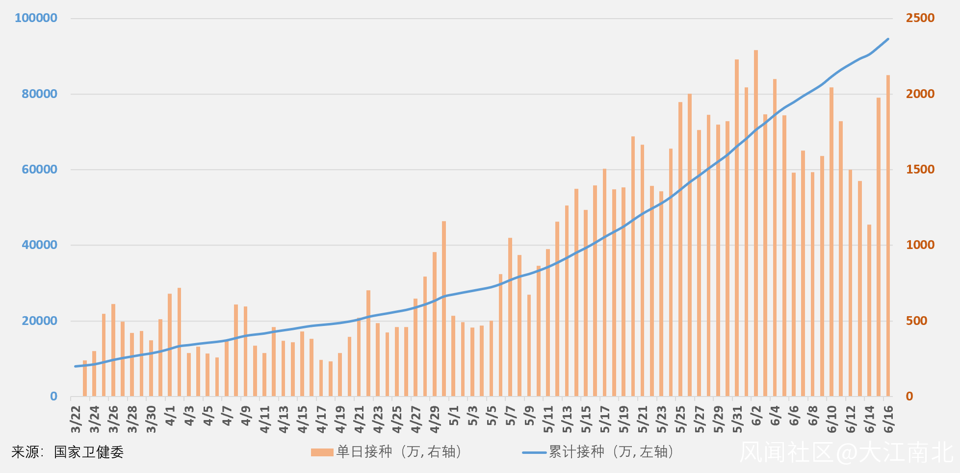 截止2021年6月16日,中國大陸累計接種新冠疫苗9.452億劑,繼續位居全球第一位,佔全球累計接種劑數的37.9%,環比增加0.3%;其中單日新增接種2124****萬劑,佔全球單日接種劑數的56.6%。我國自3月23日以來,日均接種1005萬劑。中國每百人累計接種65.66劑,環比增加1.48劑。