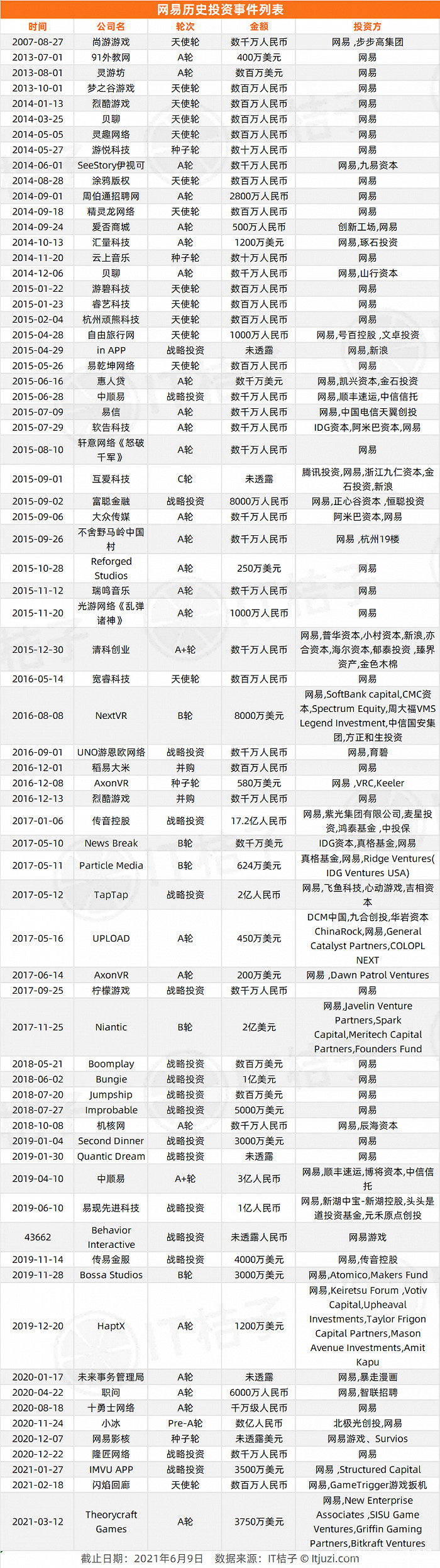 IT 桔子數據顯示,近三年以來,網易年均的投資頻率正在下降,從 2019 年的 7 起公開事件降至 2021 年截止 6 月 15 日的 3 起投資事件。綜合來説,網易發展始終有「專注自家」的味道——憑藉網易強大的研發能力,在教育、音樂、遊戲等領域中,網易往往更依賴自己的產品輸出,投資作為業務的補充展開。目前,這種態度或許正隨着網易內部業務的獨立而加強——近年來,包括網易有道已獨立上市、網易雲音樂近期正尋求上市、網易考拉/網易漫畫被出售等,網易正在用更專注「精品」的態度示人。