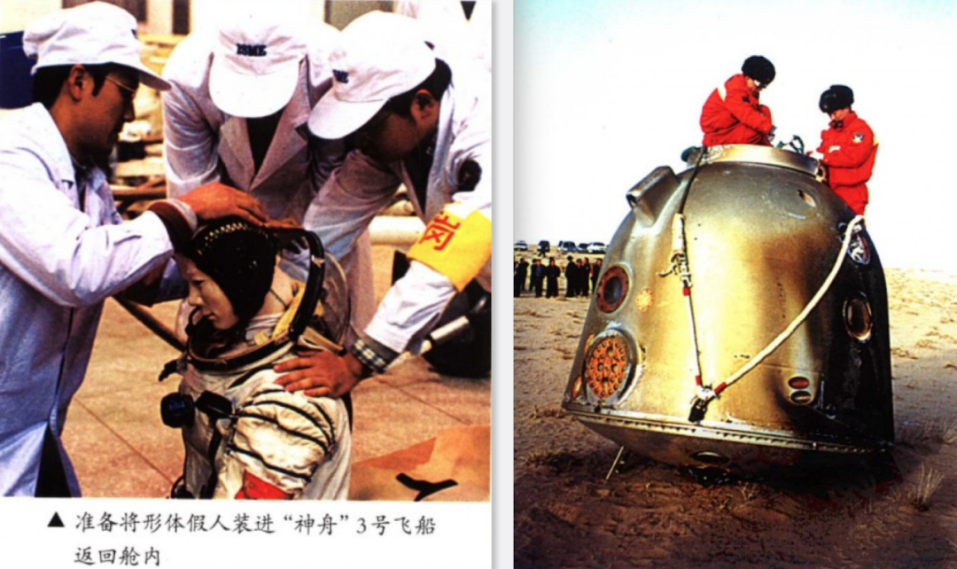 三號飛船中的假人(左),着陸後的三號飛船(右)丨來源:《載人航天器技術》