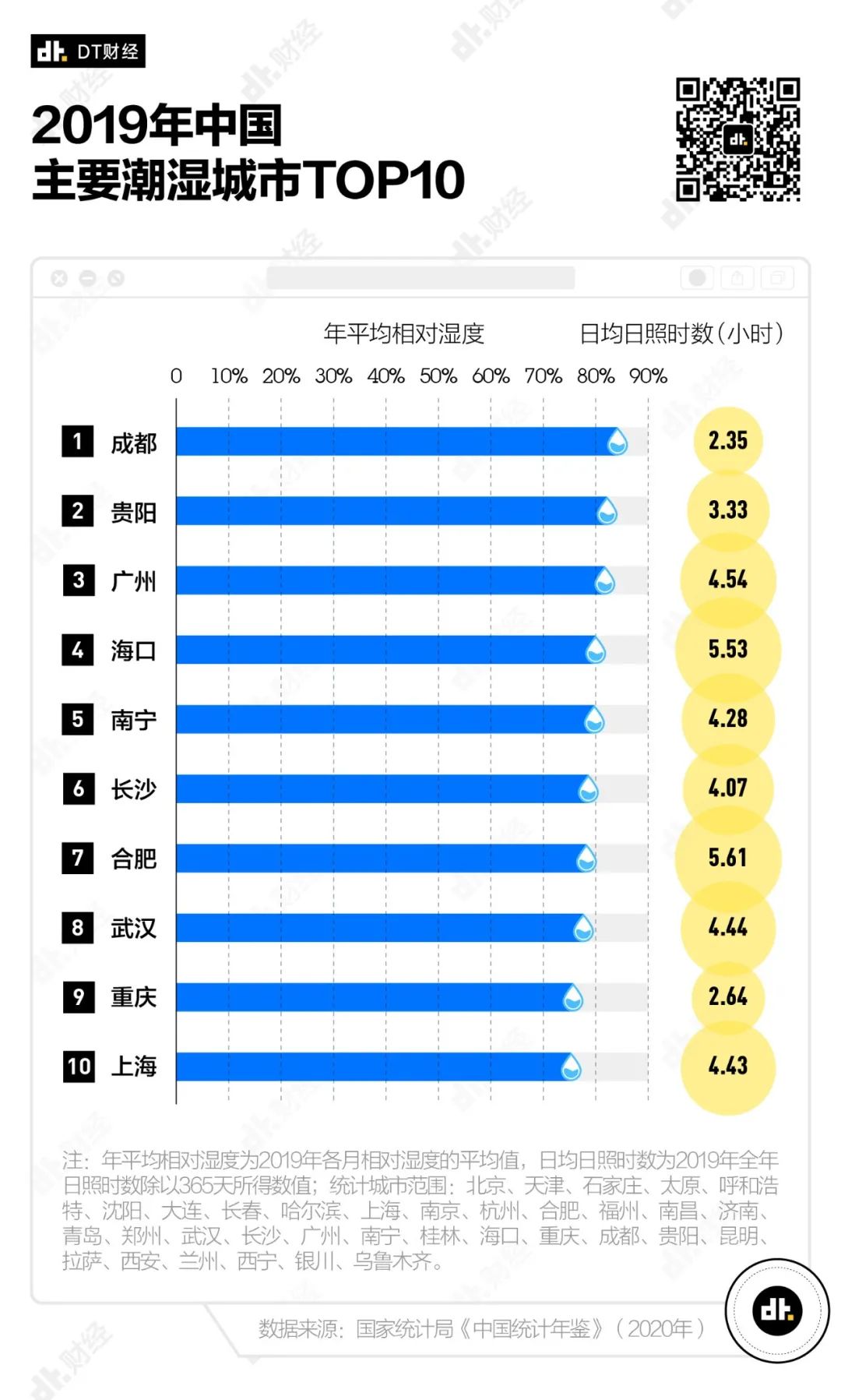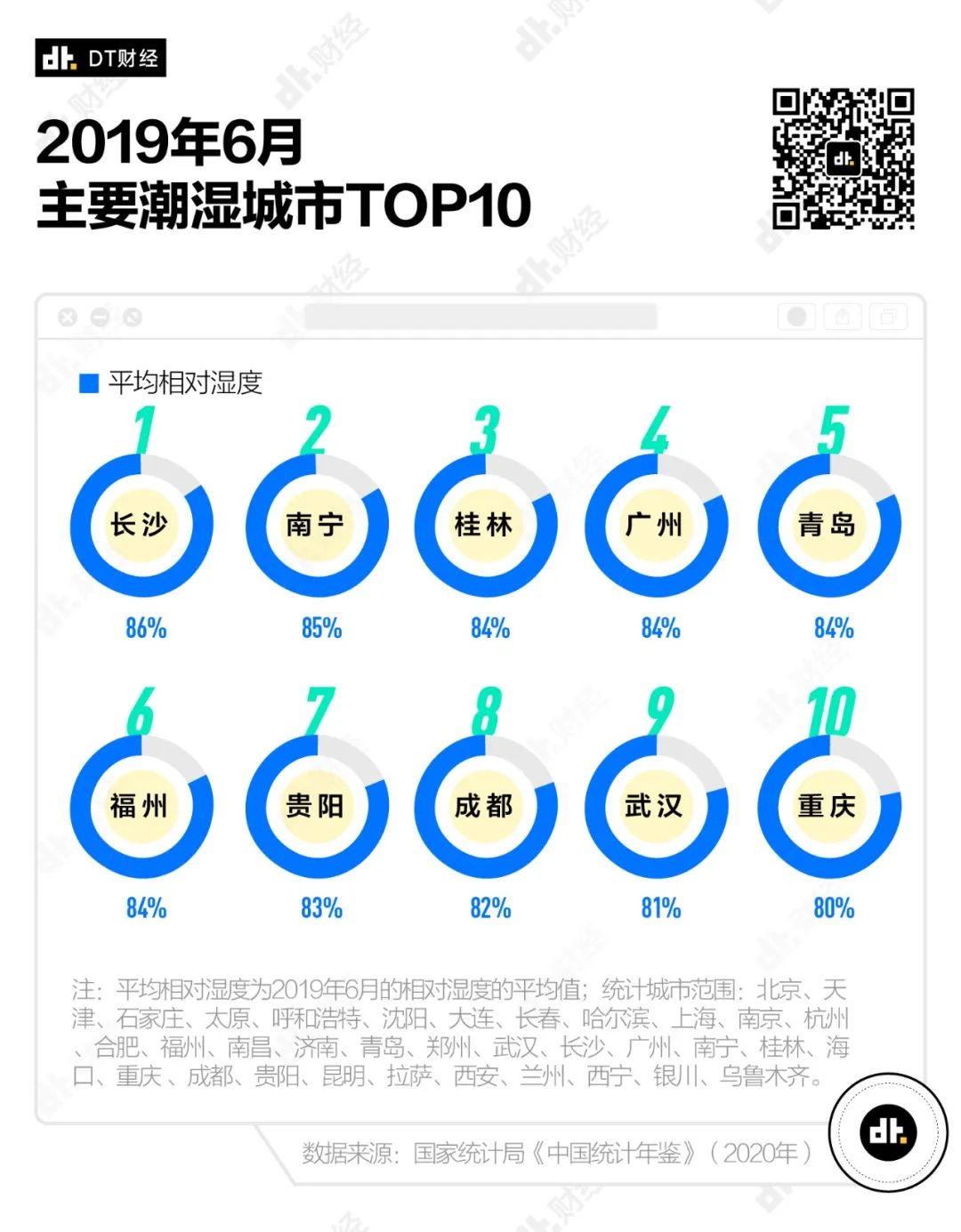 除了上榜的城市,江浙滬的梅雨天也讓人頭大。上海以79%的平均相對濕度排在第11名,杭州以78%排在第13名。高温+潮濕的重拳合體,對包郵區人民構成了超級魔法攻擊。