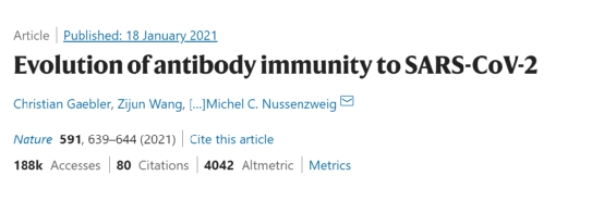 Michel C. Nussenzweig 及其研究團隊早在2021年1月18日在Nature上發文:“Evolution of antibody immunity to SARS-CoV-2”,表明感染新冠病毒的免疫力至少維持6個月,並且發現雖然血液中和抗體的活性降低了5倍,但是特異性記憶B細胞的數量保持不變!