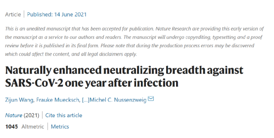 近日,由洛克菲勒大學的研究團隊在Nature上發表了一篇預印文章,標題為:“Naturally enhanced neutralizing breadth against SARS-CoV-2 one year after infection”,表明在被新冠病毒感染一年後,仍然維持了對新冠病毒的免疫力,並有增強的趨勢!一經發表便引起了廣泛的關注,這對於控制疫情的傳播是十分可喜的成果!