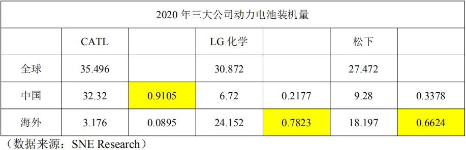 反觀寧德時代的對手們,則展現出相反的境況。2020年LG化學和松下的全球裝機量分別達到30.8GWh和27.5GWh,分別位列世界第二和第三,來自中國市場需求的裝機量佔兩者總量的比重只有21.77%和33.78%,換言之他們的重心在海外。