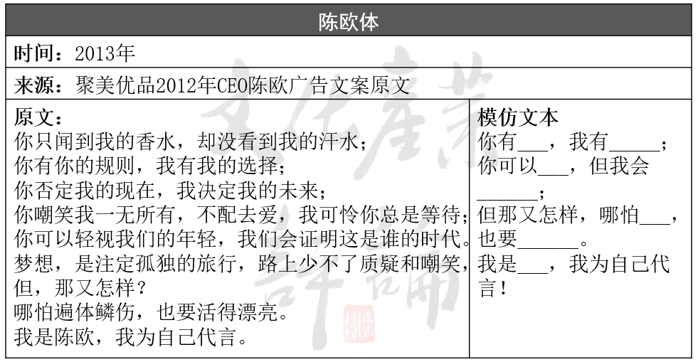 2013年火起來的“陳歐體”,應該是這些年最為勵志的文字梗。“陳歐體”走紅,恰逢早年創業浪潮的興起,一句**“我是某某某,我為自己代言”説出了許多80、90後“做自己”**的心聲。陳歐的這則廣告若是放在今天播出也極有可能走紅,因為無論時間怎麼變遷,年輕人往往都渴望着能成為自己命運的主宰,能為自己代言。