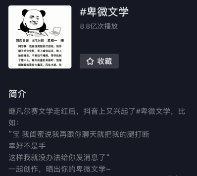 2021年,抖音興起“卑微文學”,一聲“寶”加舔狗式文學日記文學,很快引起抖人們的爭相模仿,多個短視頻獲贊高達幾十萬至上百萬次。儘管卑微文學的火熱程度不及凡爾賽文學,#卑微文學#在抖音也創造8.8億次巨大播放量。
