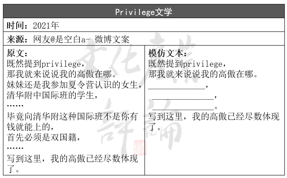 “Privilege文學”則是特權階層自上而下的“炫耀”,這也引發了大眾對特權的激烈探討;凡爾賽文學與privilege文學皆有傲嬌與炫耀的一面,但毫無疑問,凡爾賽文學更為大眾所接受,凡爾賽多多少少是部分年輕人真實生活寫照的一面;而“Privilege”背後的階級分化、教育與醫療資源分佈不公等社會問題,不是網友們用調侃與自嘲所能解決的。