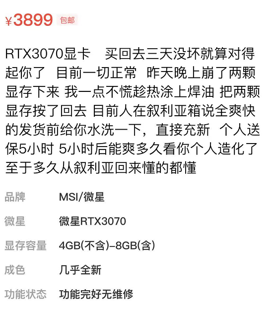 比如這位老哥,芝麻信用優秀,宣稱自己人在敍利亞,各品牌貨源充足,直接掛出 3899 元的原價 3070 ,懂得都懂。