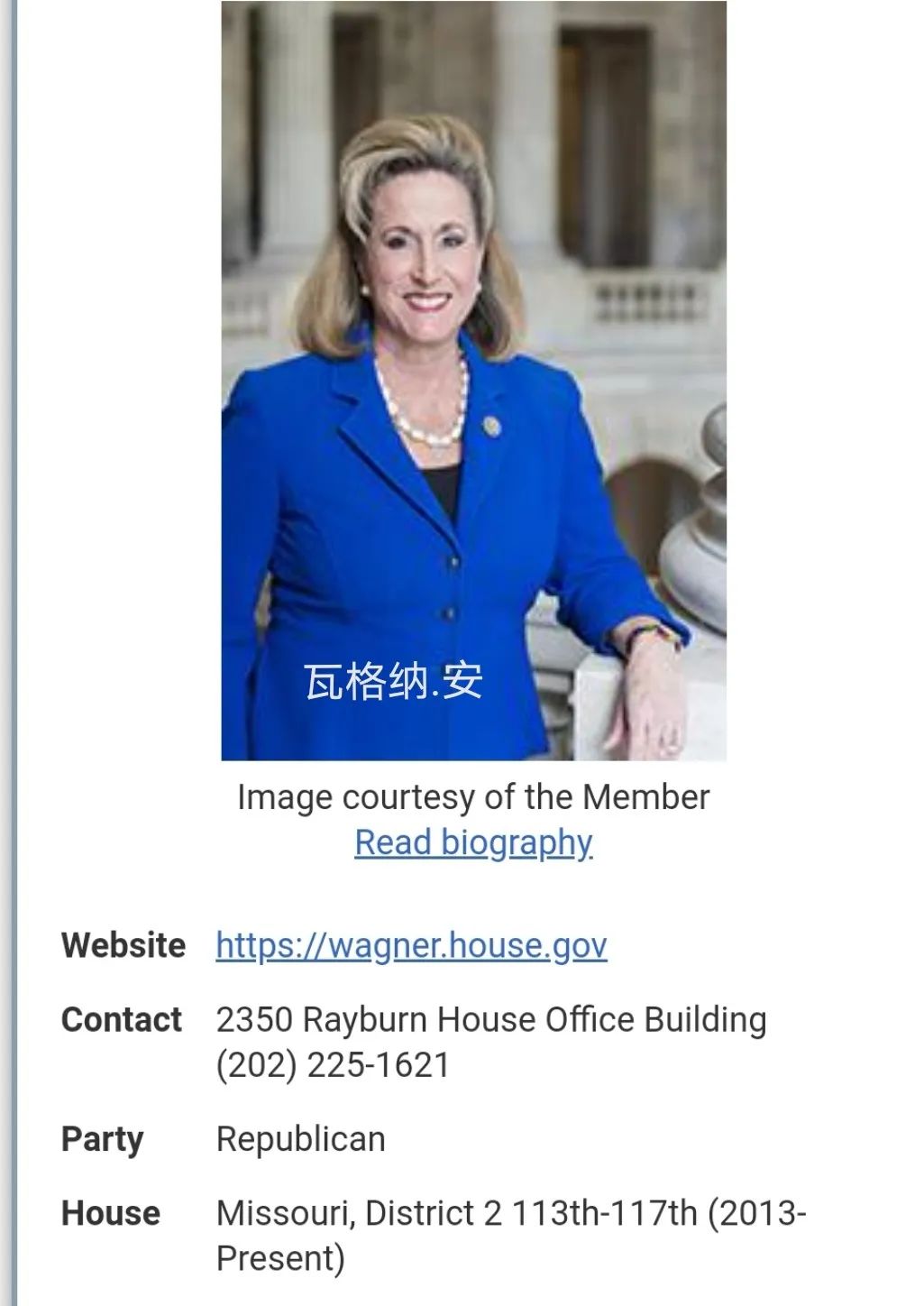 此女來自美國密蘇里州,政策觀點偏保守,是2017年美國會成立的東南亞問題議員小組成員;2019年曾強烈反對臉書搶美聯儲鑄幣權的動作。