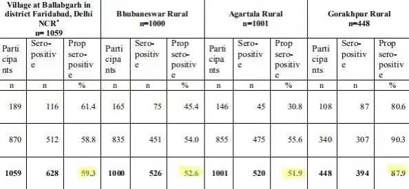 陽性率較高的戈勒克布爾農村,達到了87.9%,而其他三個地區(包括德里周邊農村),抗體陽性率區間在51.9%-59.3%。