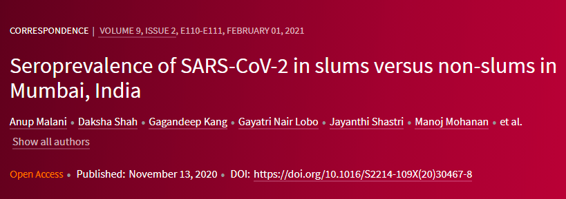 [1]Seroprevalence of SARS-CoV-2 in slums versus non-slums in Mumbai, India DOI:https://doi.org/10.1016/S2214-109X(20)30467-8