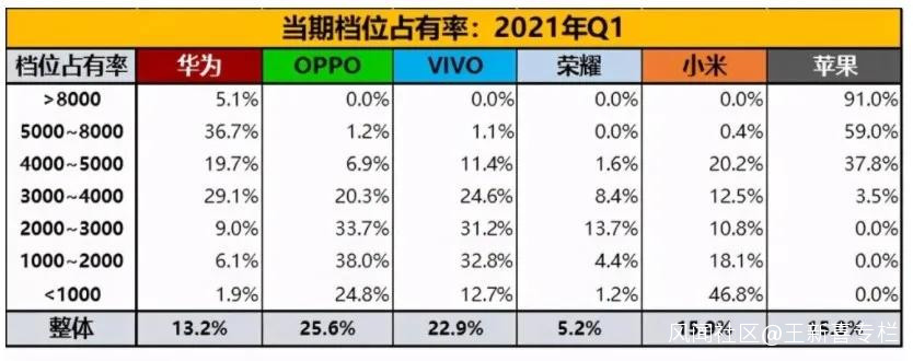 而長期發佈中國手機市場零售數據的知名博主@安乎都護府長史的數據顯示,2021年手機市場,5000元以上的高端市場,依然被蘋果和華為佔領。OPPO、vivo和小米三家加起來的市佔率僅為2%。