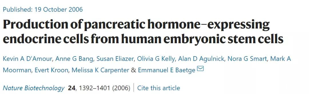 在2006年,Novocell公司(現名Viacyte)的研究團隊在Nature Biotechnology上發表論文,描述了將人類胚胎幹細胞分化成為能夠分泌胰島素、胰高血素等多種激素的內分泌胰島細胞的過程。