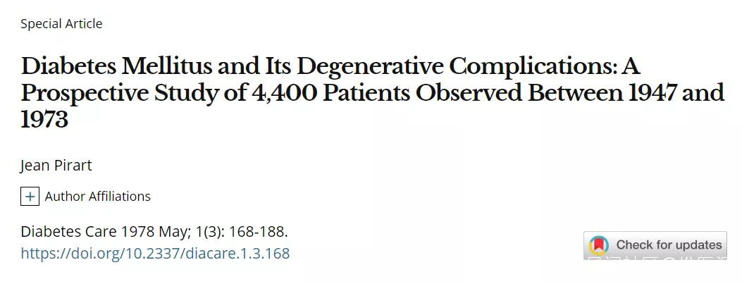 上個世紀中葉,人們已經認識到糖尿病與包括神經病(neuropathy)、視網膜病和腎病等一系列退行性疾病之間的聯繫。然而,這些併發症與血糖控制之間的精確關聯還沒有得到足夠的重視。比利時醫生Jean Pirart在1977年發佈了長達30年的縱向研究,對4398名糖尿病患者的血糖控制和併發症狀況進行了分析(這項研究首先在1977年以法文發佈,在1978年翻譯成英文)。在研究的頭25年裏,總計對這些患者進行了接近21000次檢查。這項研究的患者數目和隨訪時間在當時都是史無前例的。Pirart醫生和他的同事們的研究成果反映了血糖控制狀態與併發症之間的關聯,並且展現了通過控制血糖,有望降低併發症風險的前景。