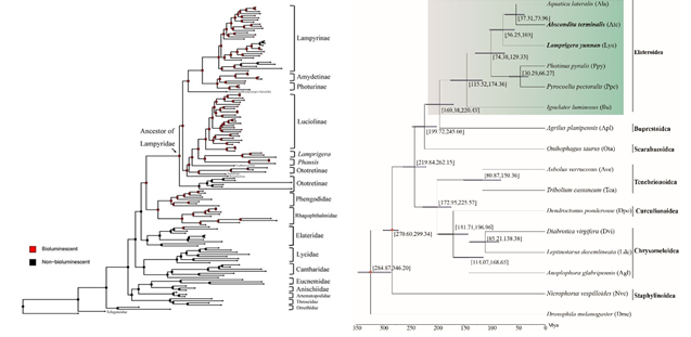 分子系統樹顯示扁螢(Lamprigera)與熠螢亞科更近的關係,左圖為線粒體基因組和核rDNA樹(Chen et al., 2019),右圖為全基因組系統發育樹(Zhang et al., 2020)